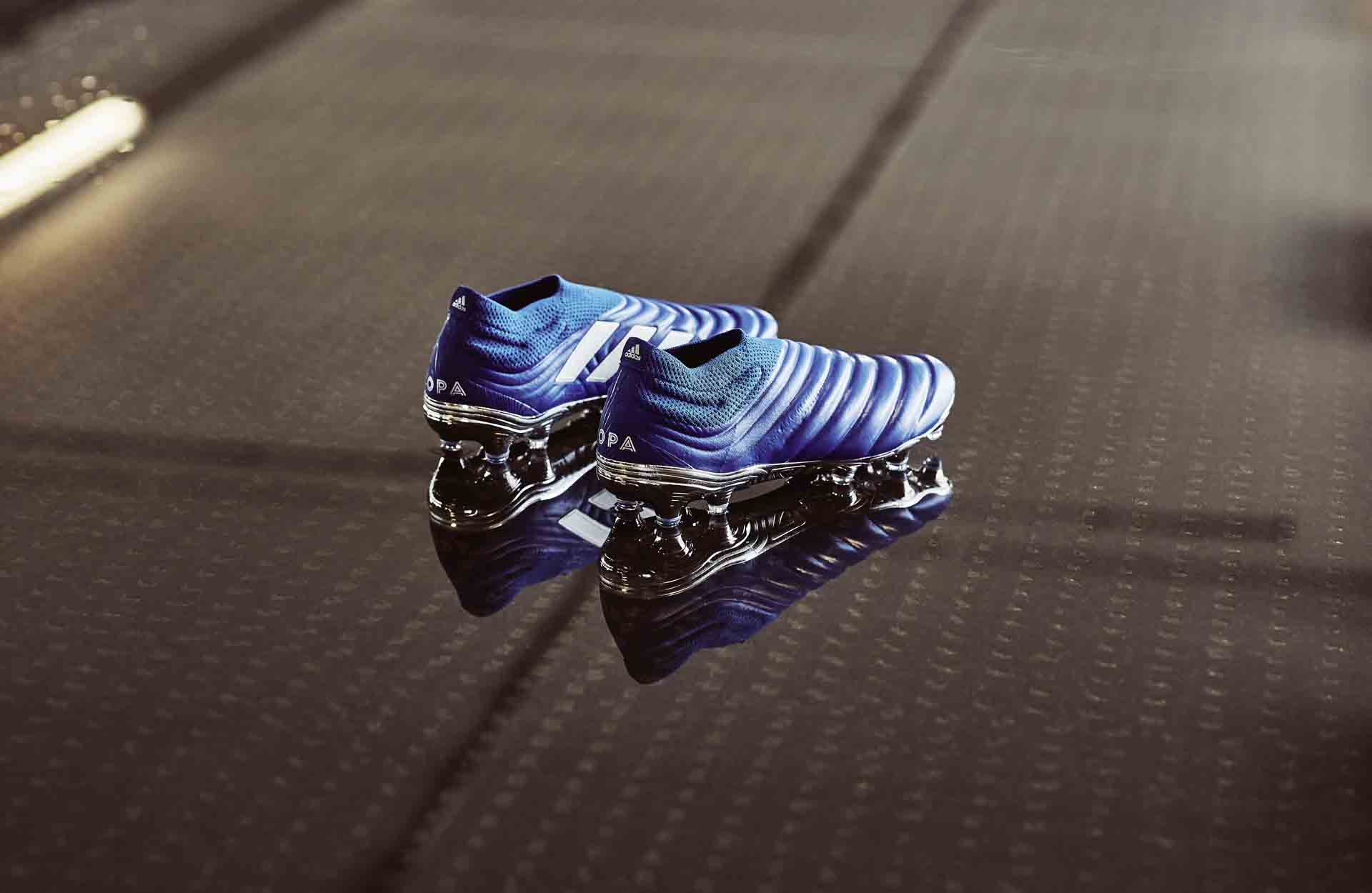 Với COPA 20+, Adidas lựa chọn cách bao phủ một lớp xanh thẫm bao quanh thân giày. Điểm nhấn duy nhất đến từ logo ba sọc màu trắng, nằm ở chính giữa thân giày. Toàn bộ đế của giày đá bóng adidas COPA cũng được phủ một lớp màu bạc, khá giống với phiên bản Predator.