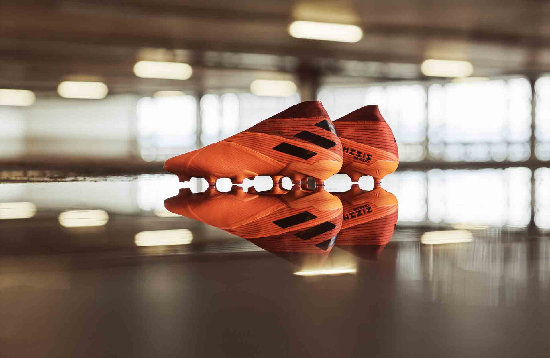 Và cuối cùng, không thể không kể đến Nemeziz 19+, một phiên bản vốn đã được nâng cấp, mang khá nhiều nét tương đồng với dòng X cho tới khi X Ghosted xuất hiện. Nemeziz có thiết kế mờ dần theo chiều ngang thân giày, bắt đầu từ phần cổ giày với phối màu Glory Red, chuyển dần xuống Signal Coral, với ba vạch màu đen trên thân giày là điểm nhấn chủ đạo. Nhưng khác với hai dòng giày trên, phần đế của giày đá bóng adidas Nemeziz không có sự tách biệt về màu sắc, thay vào đó là sự đồng bộ về màu sắc với thiết kế của thân giày.