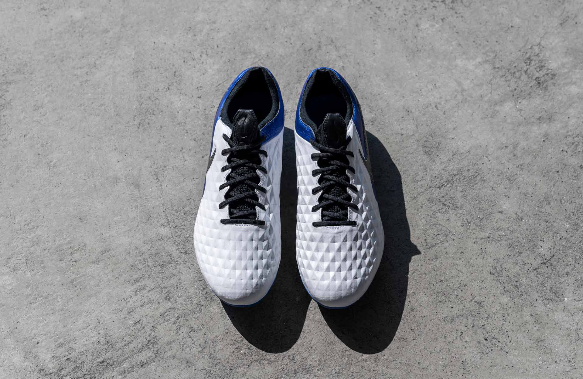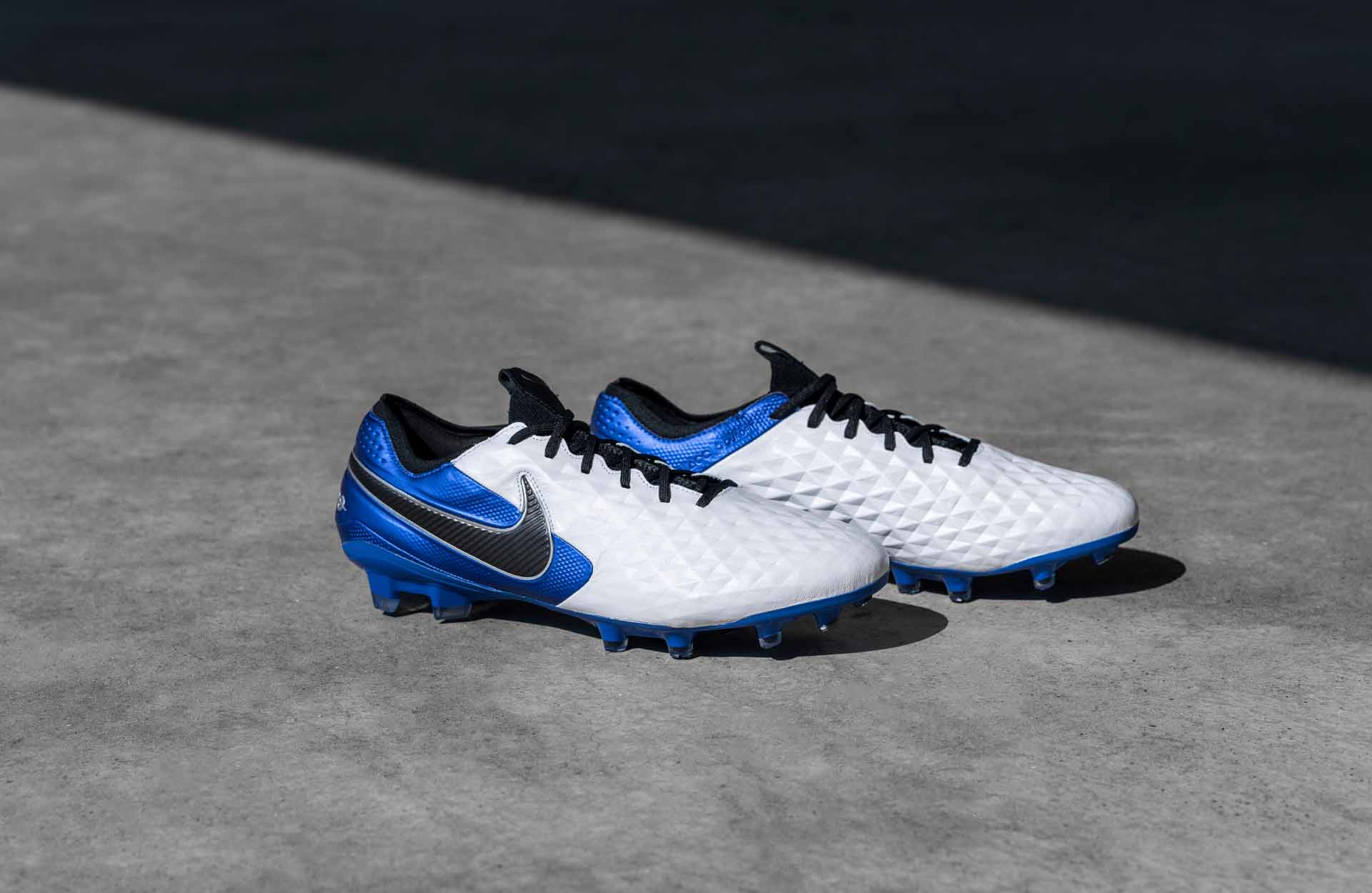 Không thể không kể đến chính là giày đá bóng Nike Tiempo, với vẻ ngoài không có quá nhiều thay đổi. Màu xanh chủ đạo ở phần gót giày, bao quanh phần gót Quadfit Mesh, toàn bộ phần upper da Kangaroo được sử dụng toàn bộ gam màu trắng. Phía dưới upper vẫn là công nghệ Flyknit, giúp đảm bảo sự chắc chắn cũng như sự vừa vặn cho bàn chân từng người sử dụng. Phần logo Nike, lưỡi gà và cổ giày được phủ gam màu đen hoàn toàn tương phản, nhưng vô cùng bắt mắt cho tổng thể đôi giày.